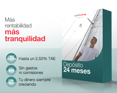 Openbank ha ampliado su plazo de comercialización hasta el 31 de diciembre del 2012 su Depósito a 2 años, una propuesta ofrece un tipo de interés del 2,50% TAE (2,48% nominal anual) con abono de intereses en la cuenta corriente operativa a 24 meses desde su contratación.